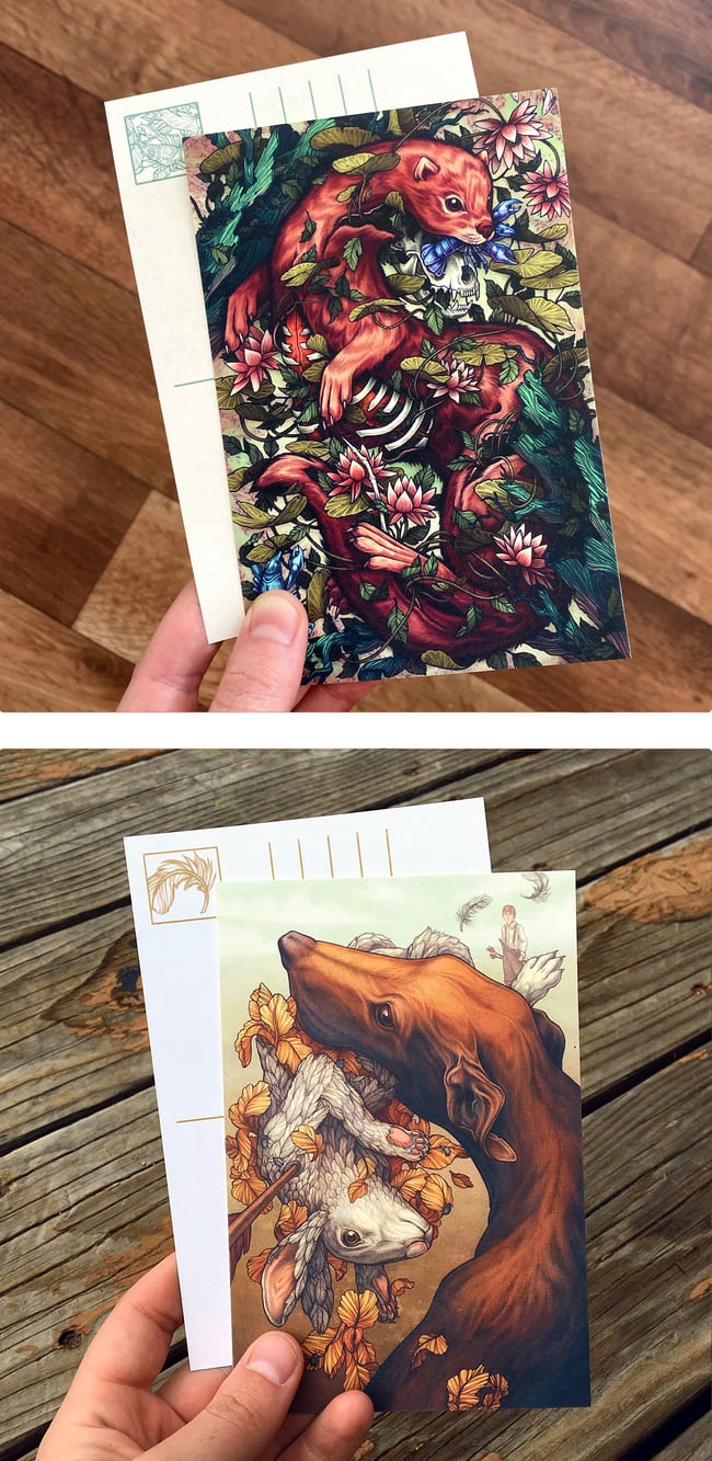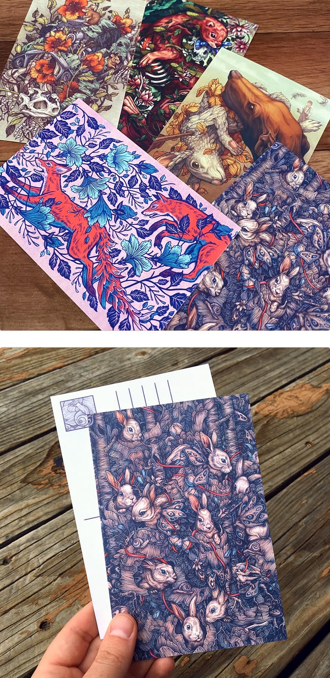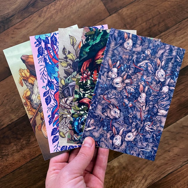 5 different 4"x6" postcards of my illustrations, printed on thick card stock paper with a matte finish. These have a blank backside with a postcard layout. They can be used as postcards, or framed as mini art prints.