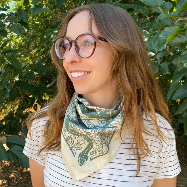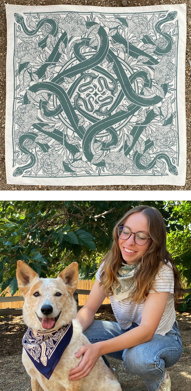 This is a screen printed bandana with a Botanical Snake design. This color is Laurel, it's a cream bandana, printed with a teal green colored water-based ink. These bandanas measure 22"x22" and are 100% cotton.